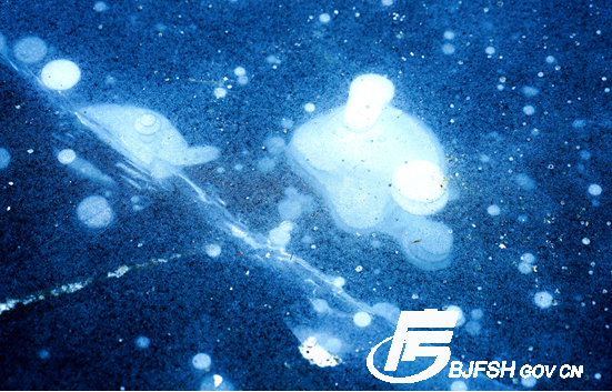 这里的温度比市内低10度左右,空气特别清新,水库冰面下面有防护网,人们可以在冰上安全的尽情撒欢儿,冰层下的冰泡形形色色,有两只小乌龟在冰里。